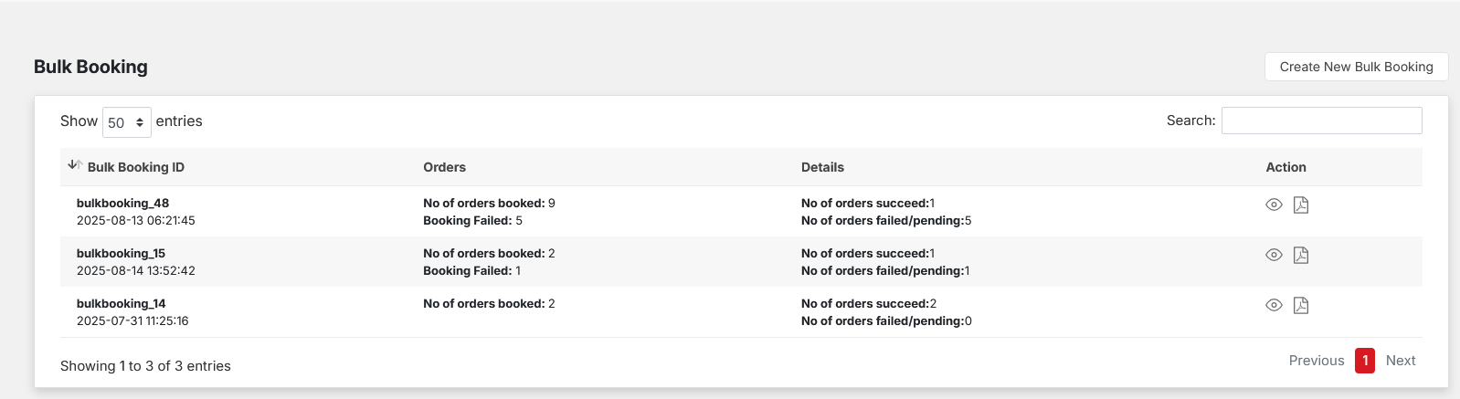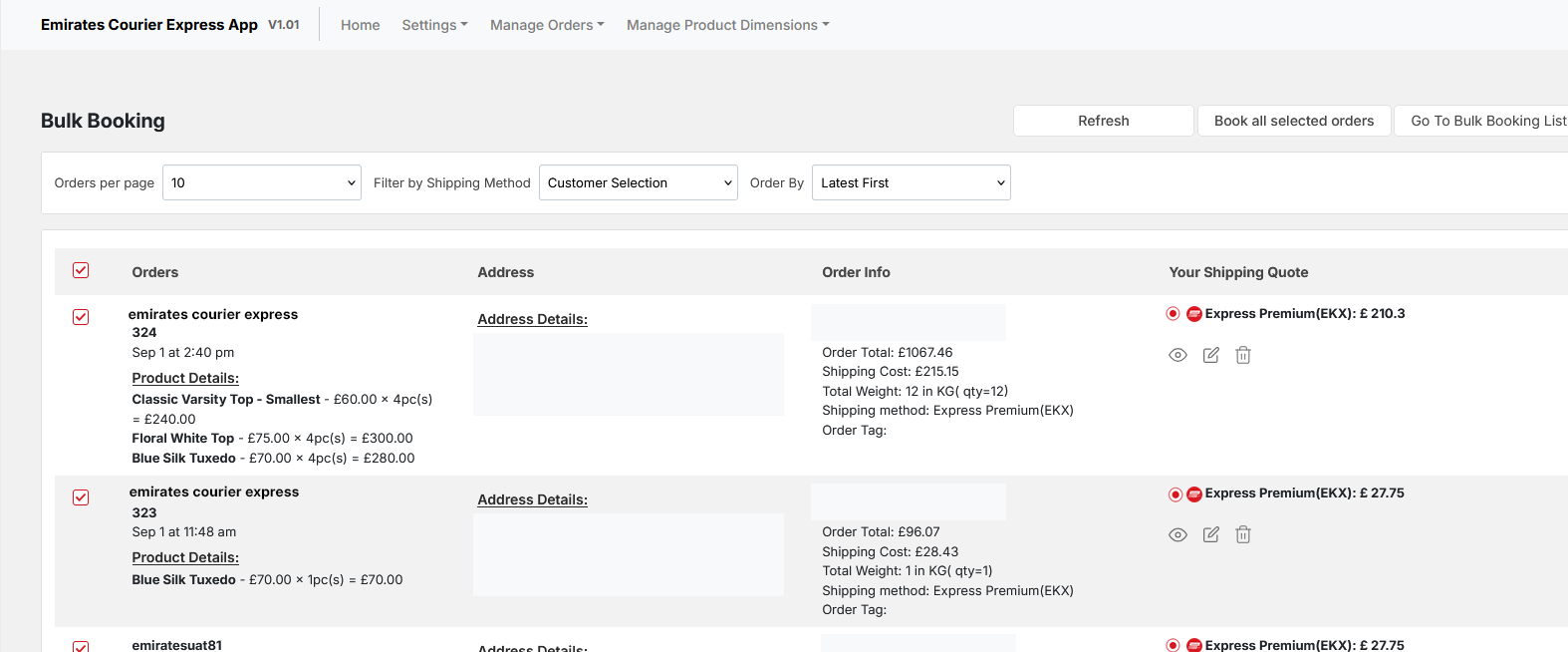 Bulk Booking is a feature of the Emirates Courier Express App which allows many orders to have their shipments booked in a single step. The shipments of orders in the bulk booking are saved into a batch where all labels are combined into a single merged PDF for printing.