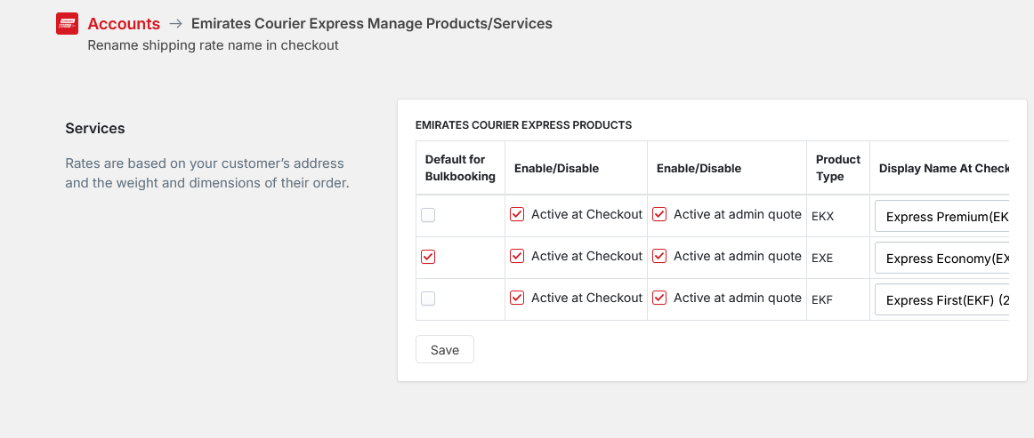 Once you have created the rates you can add the services you want in your checkout for Emirates.
