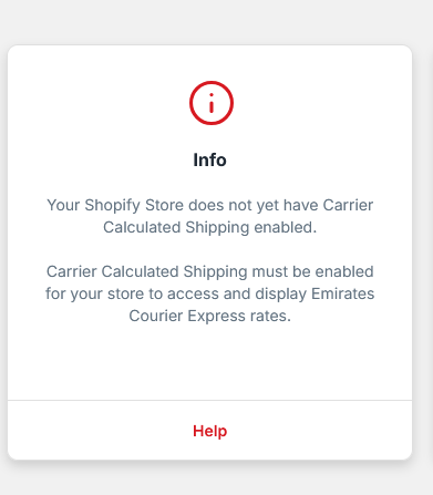 To check whether this has been enabled you can check the Info box on the homepage of the Emirates Courier Express App which will indicate whether Carrier calculated shipping has been enabled.