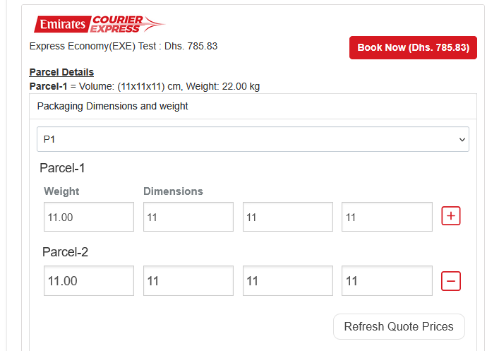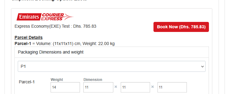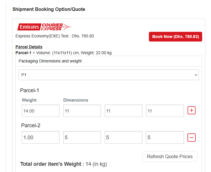 We will change the dimensions of parcel 1 and add 11kg weight (Leave dimensions)